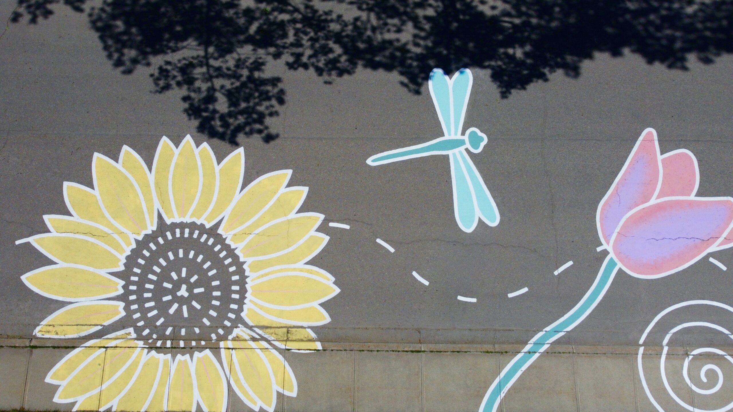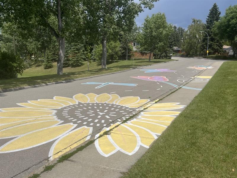 Glendale Community Association used an ActivateYYC grant to design and install a nature-inspired ground mural on the street between the school field and the community association grounds. Glendale Community Association partnered with local artist Jessica Semenoff and students from Glendale Elementary School to bring whimsy to a shared public space. Semenoff, known for her depictions of native plants in the places she paints, designed a mural of local floral and fauna. Semenoff also drew inspiration from over 100 drawings created by the students at the school.