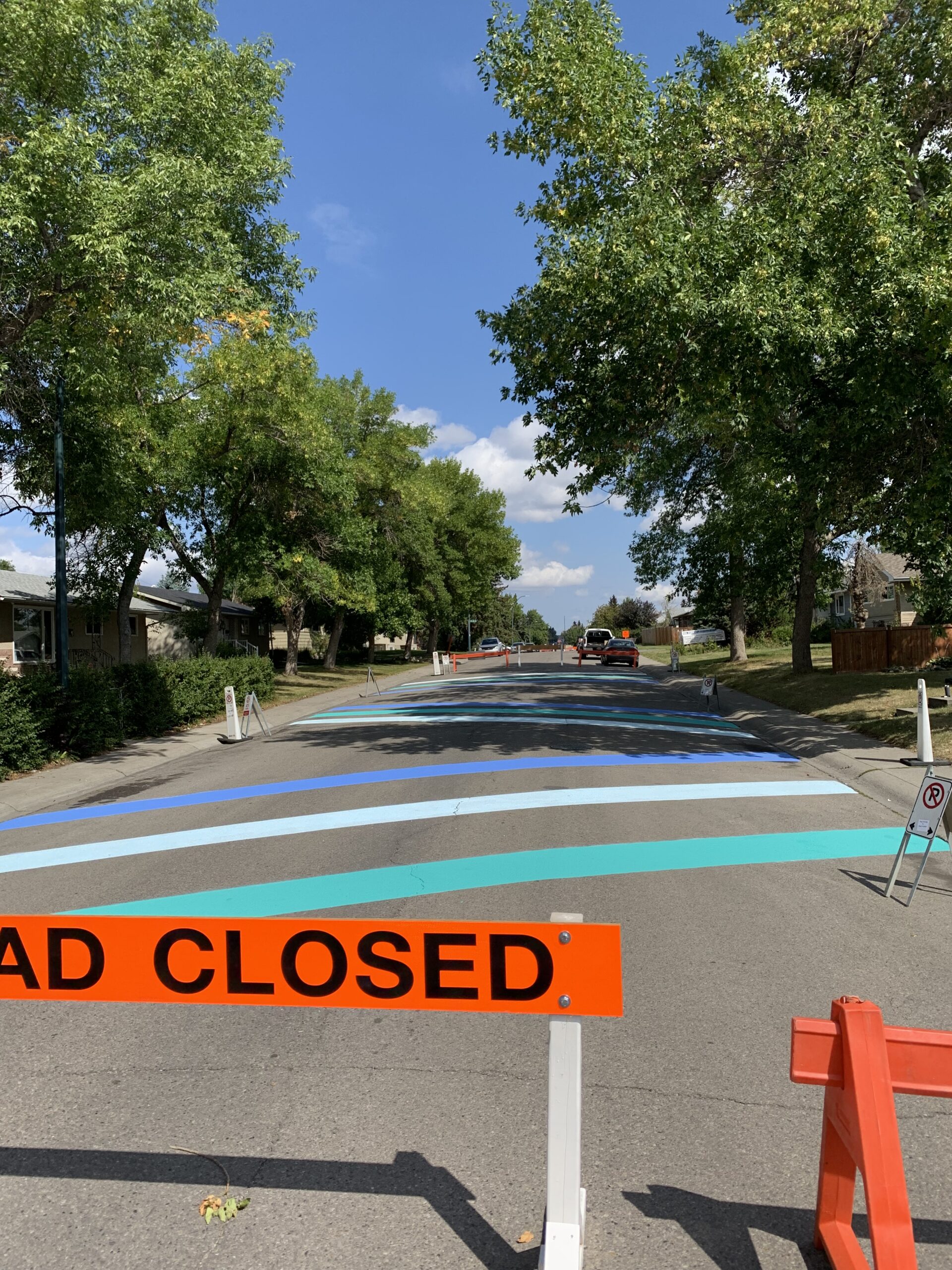 Southview Community Association received an ActivateYYC grant and painted two sections of the street where speed-bumps and bump-outs would traditionally be located to slow traffic. During paint day, community members stopped by to chat, introduce themselves, or discuss traffic calming concerns.