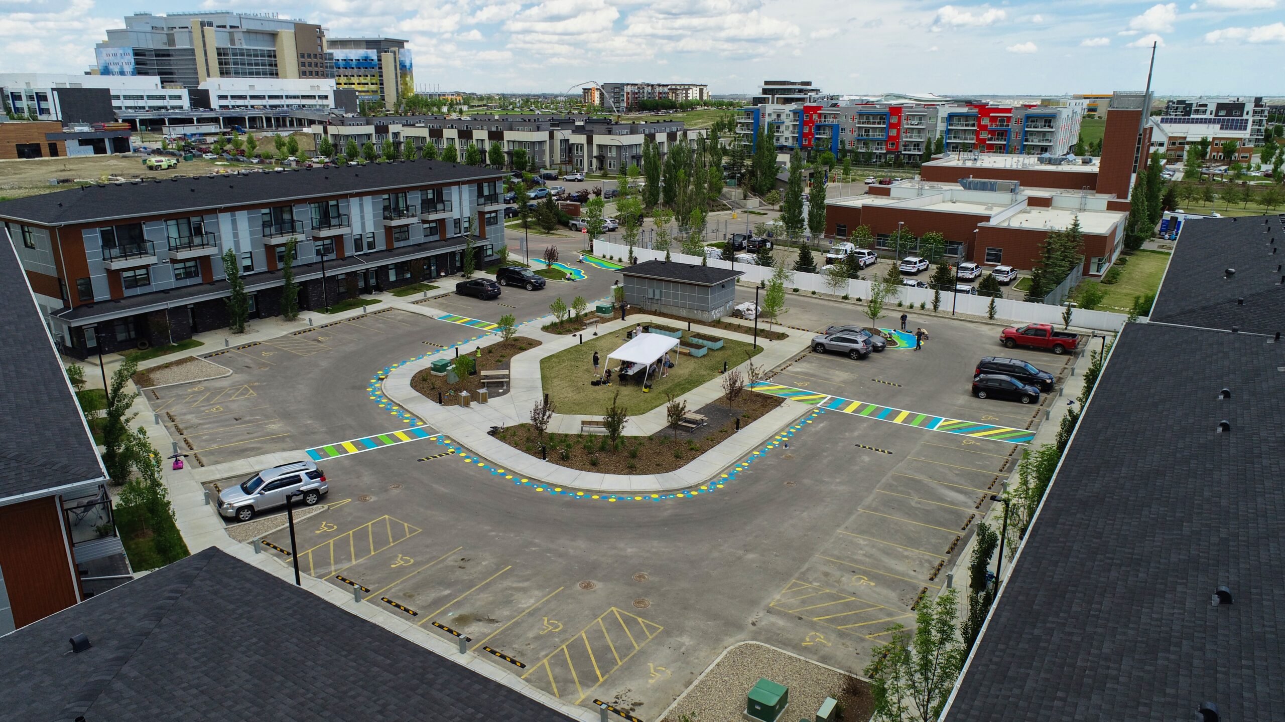 HomeSpace brought together volunteers from Rumi, UrbanCSA, and residents from the buildings, to add bright crosswalks, road thinning traffic calming measures, and polka dots hand printed with hands of children living in the complex. The volunteers also set up a badminton net for the space.