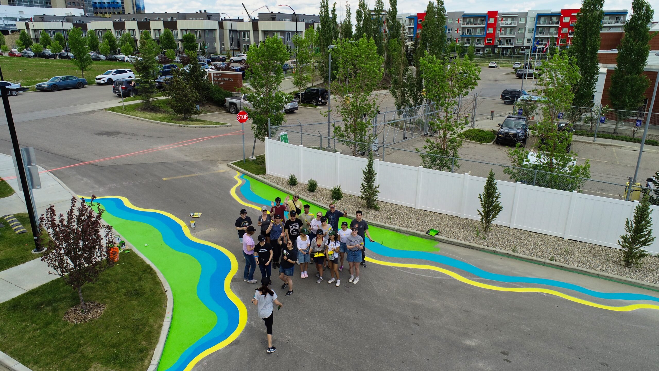 Homespace Society received an ActivateYYC grant to brighten up a courtyard within their Norris House property in the community of Seton. The inner courtyard space of the housing property was an active space used by local children riding their bikes, scooters, and playing soccer on the greenspace. HomeSpace Society wanted to ensure that the area was safe to use for children, and reflected the joy they brought to the place.